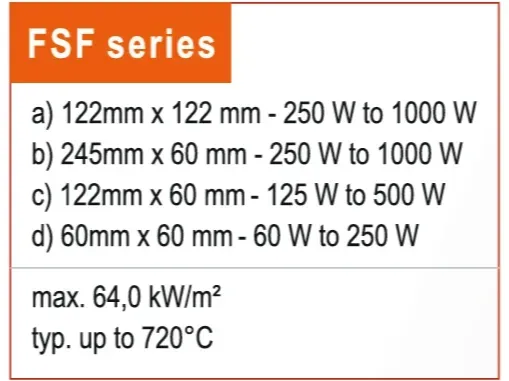 Elstein FSF panel radiators are ceramic infrared heaters with a low overall height, produced using a full-pour casting ceramic process. They are designed for operating temperatures up to 720°C and surface ratings up to 64 kW/m². Compared to Elstein radiators with a standard socket, the overall height of the FSF series has been reduced by approximately 45%. This low-profile design enables space-saving installation, making it particularly useful for retrofitting machines where space may be limited. FSF radiators are available in customary market dimensions, allowing for easy replacement.