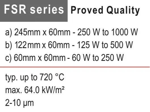 Elstein FSR series are panel radiators designed to produce maximum output in the form of heat energy. They are constructed using a ceramic full-pour casting process with a firmly burnt-in heating coil. The heater incorporates a highly heat-proof resistance wire that remains constant over the entire temperature range, ensuring a longer service life and safety against damage. The glaze used has excellent radiation properties, resulting in very high radiation efficiency. A version with a color-changing feature is also available.