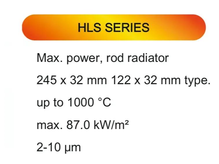 The Elstein HLS series are maximum power rod radiators designed for the most demanding thermal processes. They boast the highest operating temperature in the catalog, reaching up to 1000°C. Their combination of a linear (rod) form factor and very high power density makes them suitable for specialized, high-intensity industrial applications.