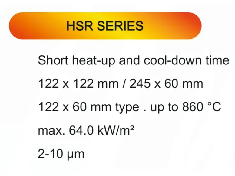 The Elstein HSR series are panel radiators distinguished by their short heat-up and cool-down times. This fast thermal response makes them ideal for manufacturing processes that involve rapid cycling or require precise temperature changes. They operate at high temperatures up to 860°C and can be integrated into larger systems like the BSI construction panels.