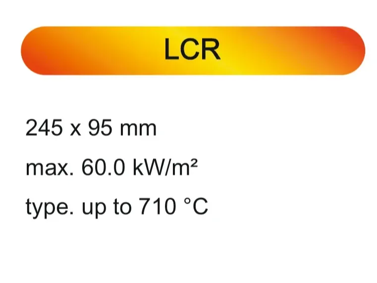 The Elstein LCR is a long, narrow ceramic infrared heater. It is designed for a high power output, with an operating temperature of up to 710°C and a surface rating of 60.0 kW/m². Its linear form factor makes it suitable for heating long or narrow target areas.
