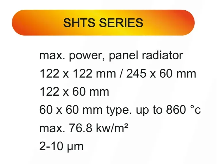 The Elstein SHTS series are panel radiators designed for maximum power output. Referred to as Super High Temperature Heaters , they are suited for demanding industrial applications that require high performance and operating temperatures up to 860°C. Their high power density makes them ideal for processes that need rapid heating rates.