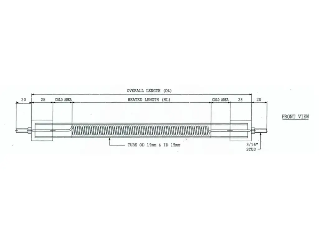 A superior quality medium wave infrared heater that consists of a helically wound resistance coil housed within a pure vitreous silica fused quartz tube. This model features a tube with an Outer Diameter (OD) of 12mm and an Inner Diameter (ID) of 15mm. The quartz tubing is terminated with specially designed ceramic insulating caps that allow the tube to breathe and are fastened with high-temperature cement. These heaters are available in clear, milky, and a special white-coated version that provides direct one-sided heating for improved energy efficiency. Made of high-quality materials, they offer superior performance and a long serving life.